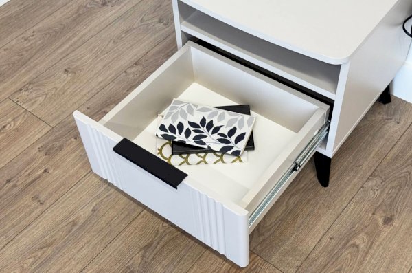 Тумба оснащена стильной ручкой и имеет удобное наполнение: выкатной ящик на шариковых направляющих и открытая ниша для хранения вещей. Это позволяет рационально использовать пространство и разместить различные предметы.